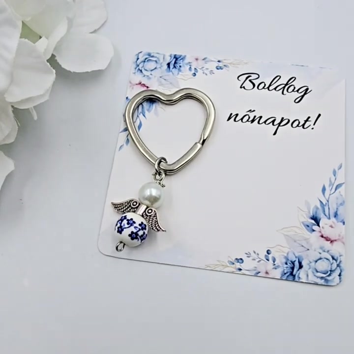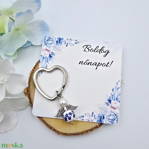 Kék virágmintás porcelán angyalka kulcstartó ajándékkártyával - Nőnapi ajándék, Boldog nőnapot! feliratos kártyával