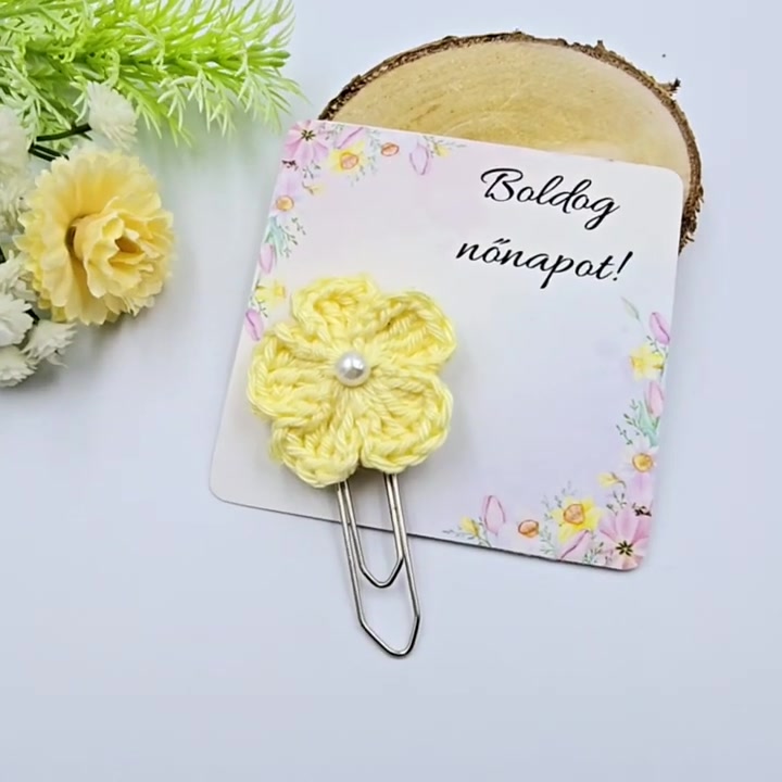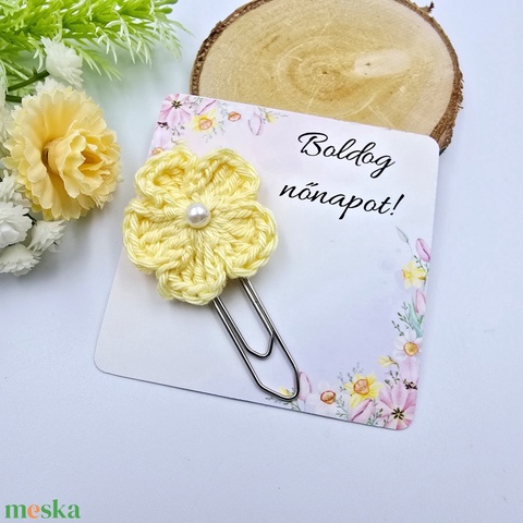Halvány sárga horgolt virágos könyvjelző óriás gémkapoccsal - Nőnapi ajándék, Boldog nőnapot! feliratos kártyával