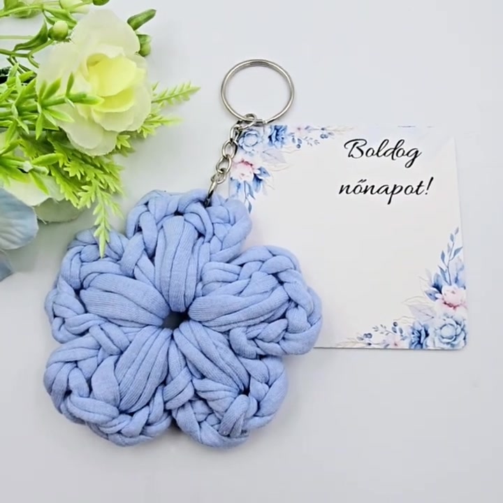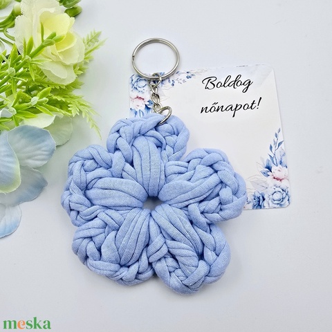 Világos lenkék horgolt virág kulcstartó ajándékkártyával - Nőnapi ajándék, Boldog nőnapot! feliratos kártyával