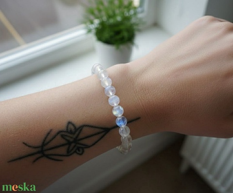 - Anyaga: gumidamil, szivárvány holdkő gyöngy 8 mm, rozsdamentes acél csomórejtő, bronz színű csomórejtő