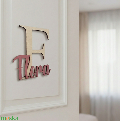 Ez a kézzel készített ajtó névtábla egy nagy, karakteres kezdőbetűből áll, amelyre kézírás stílusú betűkkel kerül rá a gyermek neve. A két elem külön színre festhető, így minden darab egyedi.