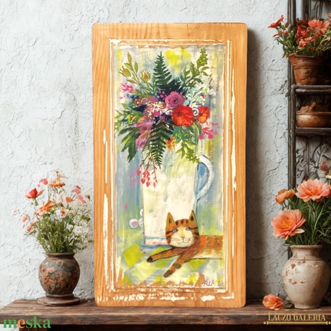 Délutáni szieszta - Rusztikus Fatábla, Egyedi Falikép, Akril Festmény - Virágok - Macska - Cica - Egér
