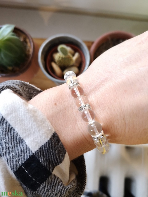 - Anyaga: hegyikristály gyöngy 8 mm, nemesacél csomórejtő, strasszos köztes