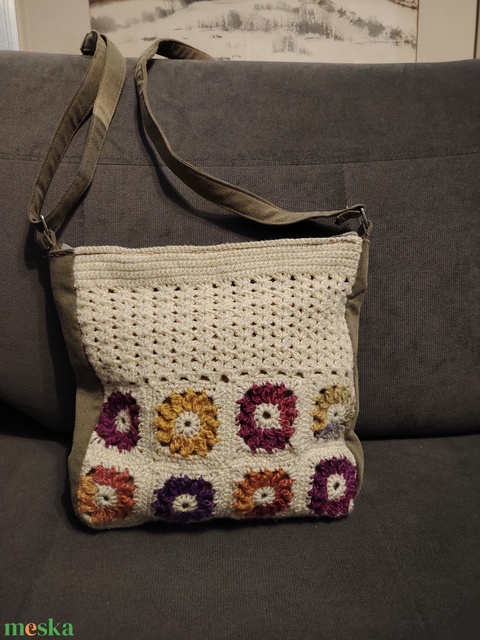 Horgolt válltáska színátmenetes virágokkal.