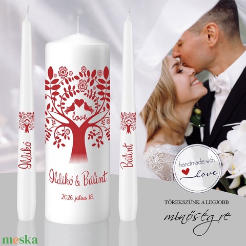 A Szerelem fája esküvői gyertyaszett a közös élet kezdetének egyik legszebb szimbóluma. A letisztult fehér gyertyatestet díszítő, piros életfa motívum a szeretet mély gyökereit, az összetartozást és a házasságban kiteljesedő közös jövőt jelképezi. A fa lombjában megjelenő szív és madárpár a kölcsönös szeretet, hűség és harmónia jelképe.