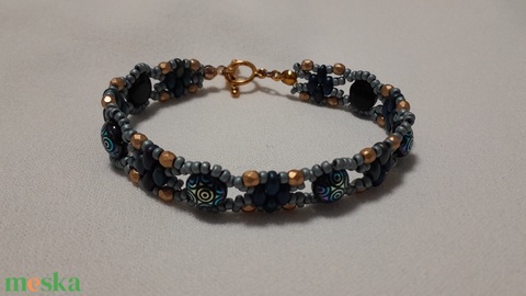 Cseh gyöngyökből, kétlyukú gyöngyökből drótra fűzött karkötő, OT-kapoccsal. A karkötő hossza 18 cm.