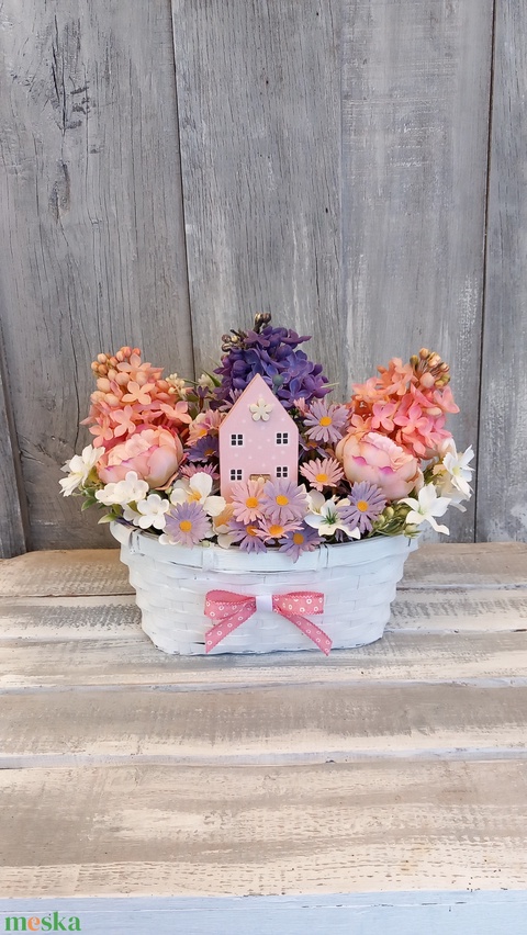 - Anyag/Összetevő művirágok, selyemvirágok, kosár, tűzőhab, faházikódekor, masni
