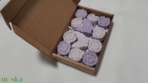 Szójaviaszból készült illatviaszok lila színben és levendula illattal. A virágos 2cm átmérőjű, a pillangó 3x3,5 cm. A kartondoboz mérete 8x13x2,5 cm.