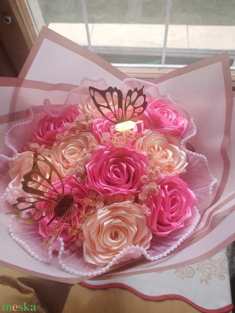11 szálas szatén szalagból készitett rózsa csokor. Ez az egy van jelenleg készleten, de bámilyen elképzelést megvalósítok.