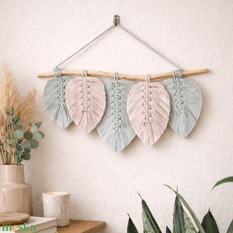 Milky Green és Nude levelek faágon - makramé falidísz