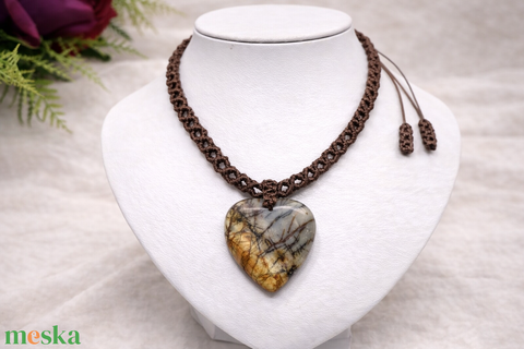 Barna makramé nyaklánc szív alakú jáspis medállal