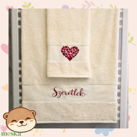 Valentin-napi hímzett törölköző szett – „Szeretlek” felirattal, ivory prémium törölközők, romantikus ajándék pároknak