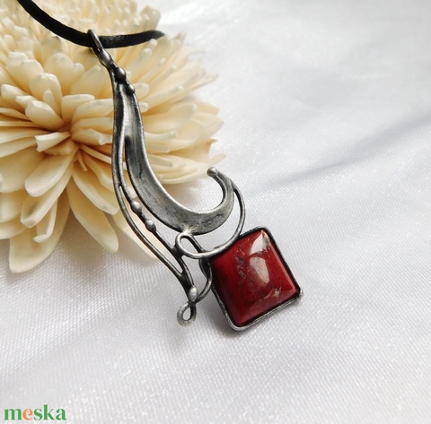 A medál Tiffany technikával készült vörös jáspis, réz és ólommentes, ezüsttartalmú ón felhasználásával. A diszítés szintén saját készítésü, nem tartalmaz gyári elemeket. A fémrészt óezüstre patináztam és lelakkoztam, hogy sokáig szép maradjon.