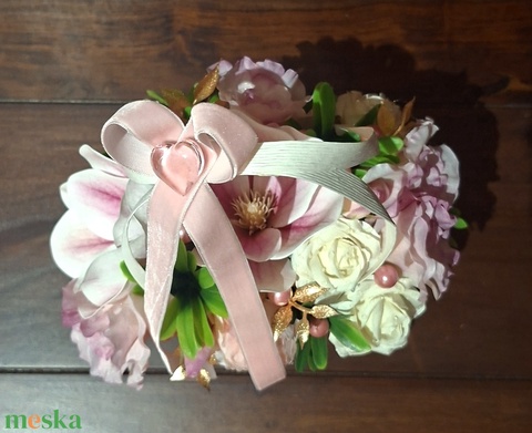 - Anyaga: dísztáska, bársonyszalag, akrilszív, liziántusz, magnólia, rózsa, gyöngyök, zöld levelek, arany levelek, akril