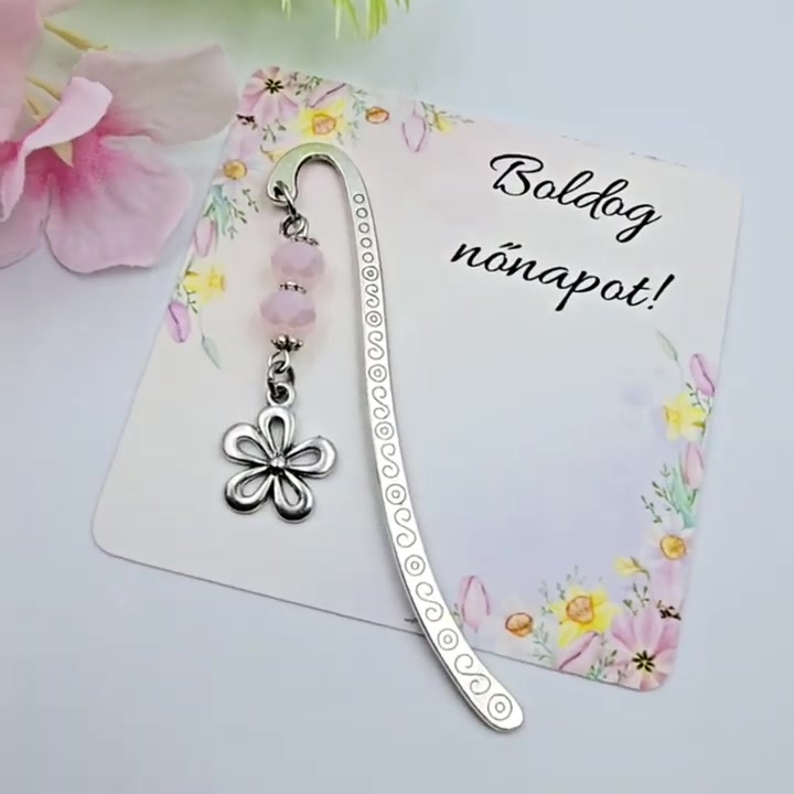 Mini könyvjelző rózsaszín csiszolt gyöngyökkel és virág medállal - Nőnapi ajándék, Boldog nőnapot! feliratos kártyával