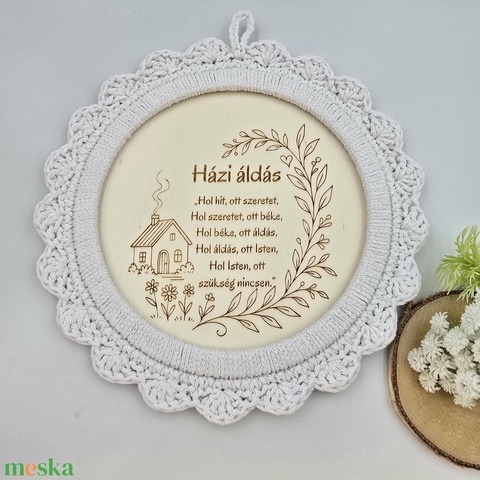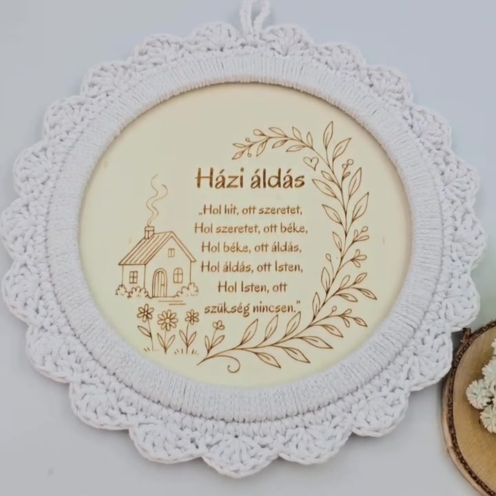 Gravírozott házi áldás horgolt szegéllyel- 21 cm