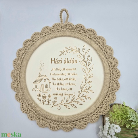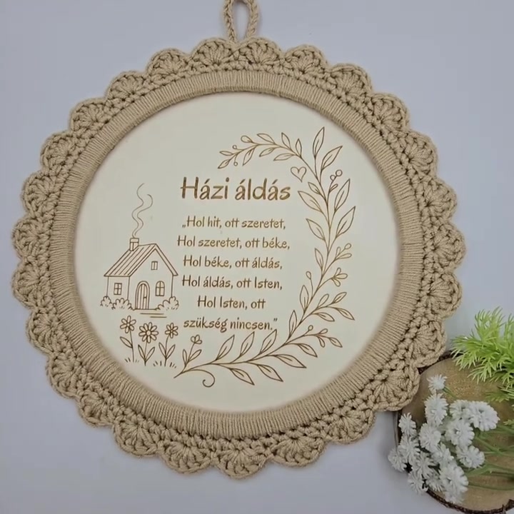Gravírozott házi áldás horgolt szegéllyel- 27 cm