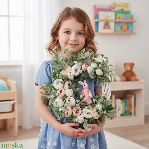 Virágos tavaszi koszorú - nyuszival, természetes hatású