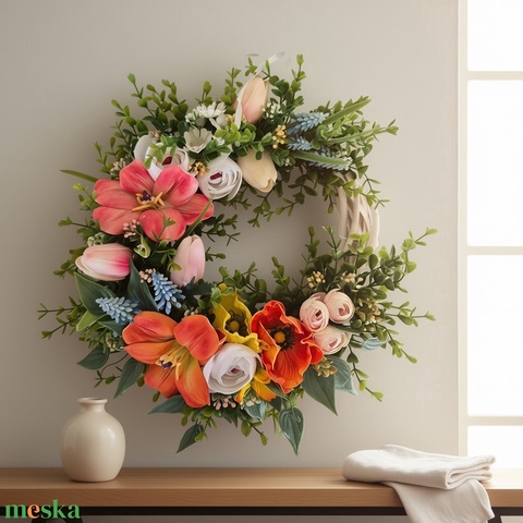 Színes virágos tavaszi koszorú - természetes hatású, élethű virágokkal