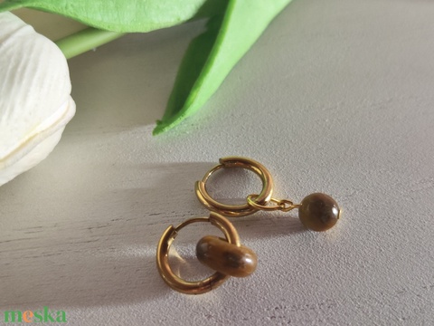 Aszimmetrikus aranyfényű nemesacél karika fülbevaló tigrisszem gyöngyökkel – Egyedi elegancia meleg színtípusúaknak!