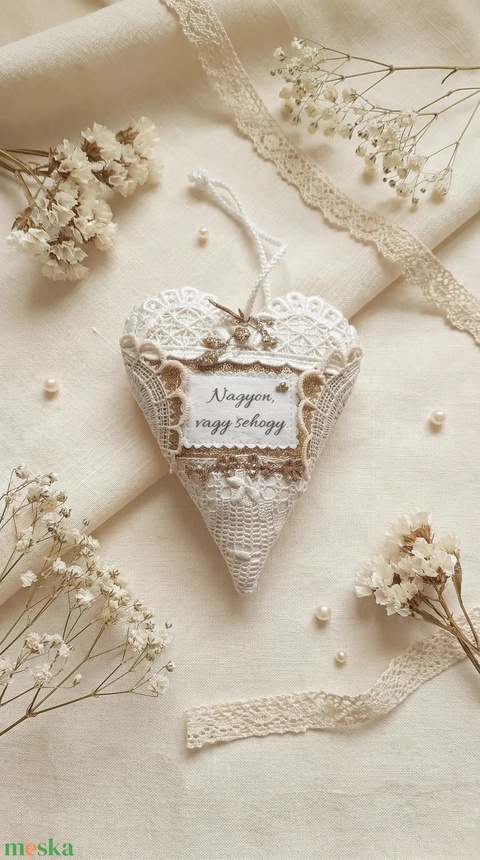 - Anyaga: horgolt zsinór, lepedővászon, csipke, csillámos filc