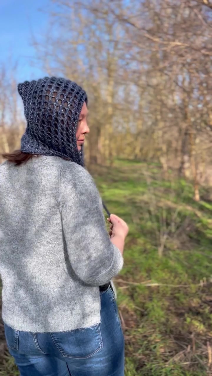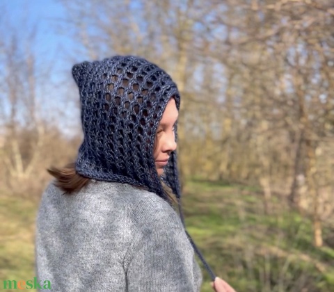 Kobaltkék, kézzel kötött női főkötő – különleges, enyhén csillogó fonalból