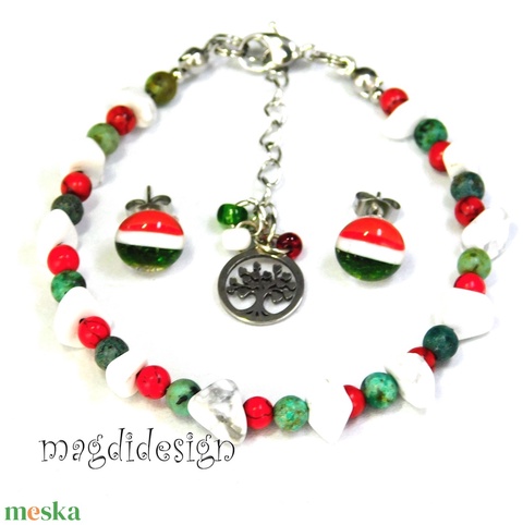 Nemzeti színű ásvány, üveg ékszerszett, karkötő, fülbevaló--Kokárda NEMESACÉL!