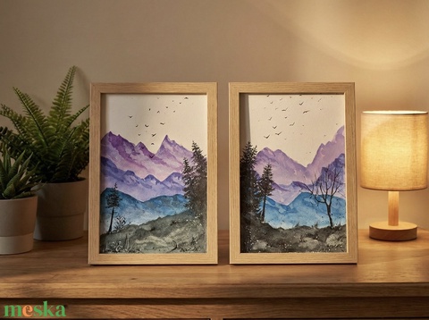 Eredeti akvarell - Lila-kék hegyek, tájkép fenyővel, madarakkal