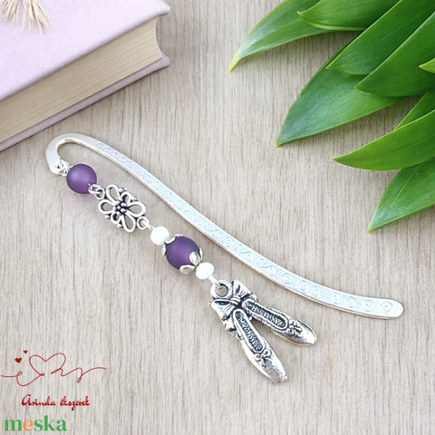 Balettcipő könyvjelző lila-fehér gyöngyökkel – elegáns ajándék táncosoknak, balett rajongóknak
