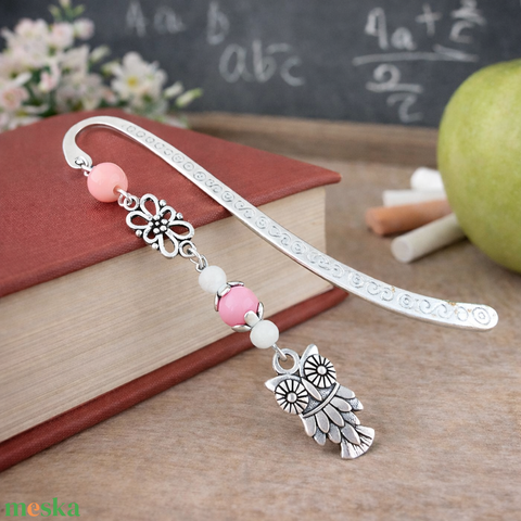 Bagoly könyvjelző rózsaszín gyöngyökkel – kézműves ajándék olvasóknak és tanároknak