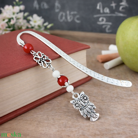Bagoly könyvjelző piros gyöngyökkel – kézműves ajándék olvasóknak és tanároknak