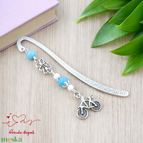 Biciklis könyvjelző – sportos, természetkedvelő ajándék szülinapra, névnapra kék gyöngyökkel