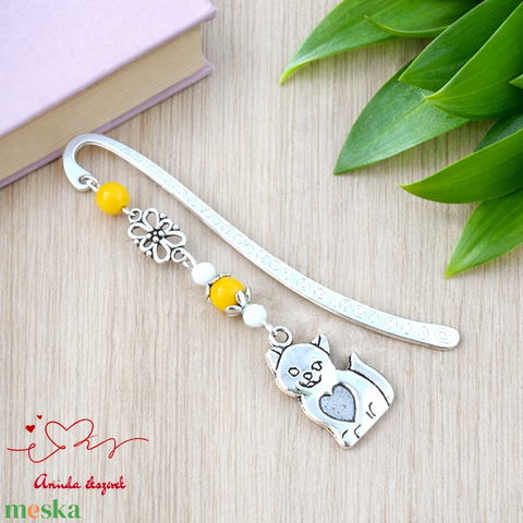 Cicás könyvjelző sárga gyöngyökkel – kézzel készült ajándék állatbarátoknak, macskakedvelőknek névnapra, születésnapra