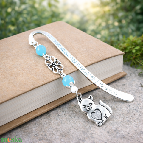 Cicás könyvjelző kék gyöngyökkel – kézzel készült ajándék állatbarátoknak, macskakedvelőknek névnapra, születésnapra