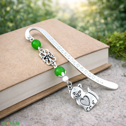 Cicás könyvjelző zöld gyöngyökkel – kézzel készült ajándék állatbarátoknak, macskakedvelőknek névnapra, születésnapra