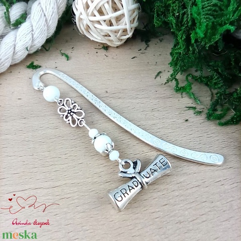 Diplomás könyvjelző fehér gyöngyökkel – ballagási és avatási ajándék diplomázóknak