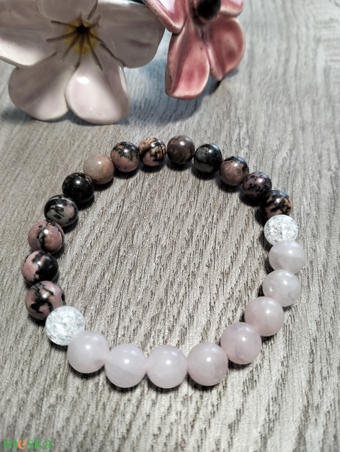 Női Ásványkarkötő - Rózsakvarc + Roppantott hegyikristály + Rodonit