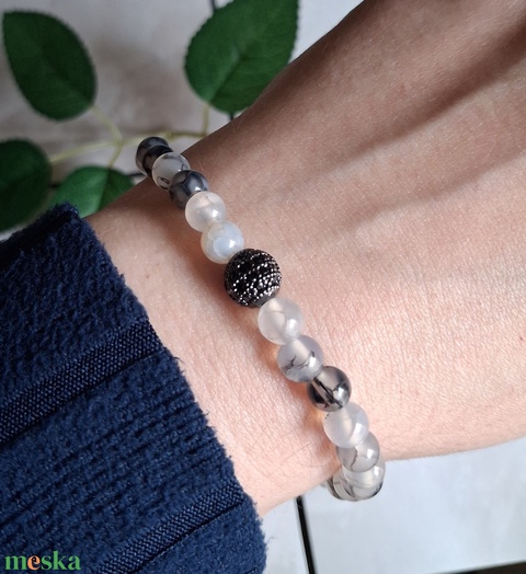 Ez a kézzel készült ásvány karkötő sárkányvéna achát gyöngyökből készült, középen díszítő fekete köztes elemmel. A fehér, szürke és mélyebb tónusú árnyalatok finom kontrasztot alkotnak, letisztult, mégis karakteres megjelenést adva az ékszernek.
