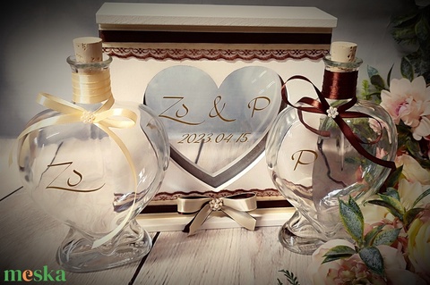 Esküvői homokceremónia szett – gravírozott szív üvegek és egyedi feliratos emlékdoboz, romantikus vintage esküvői kellé