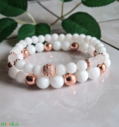 Ez a kézzel készült ásvány karkötő szett fehér hójáde gyöngyökből és rose gold színű hematit elemekből készült. A tiszta fehér és a meleg, fémes árnyalatok elegáns, nőies összhatást teremtenek, amely letisztult megjelenésével különleges kiegészítővé teszi a szettet.