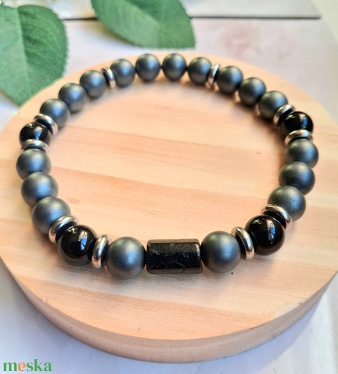 Ez a kézzel készült férfi ásvány karkötő matt hematit és fényes ónix gyöngyök kombinációjából készült, nemesacél köztes elemekkel kiegészítve. A sötét, grafitszürke és mélyfekete árnyalatok letisztult, határozott megjelenést adnak az ékszernek.