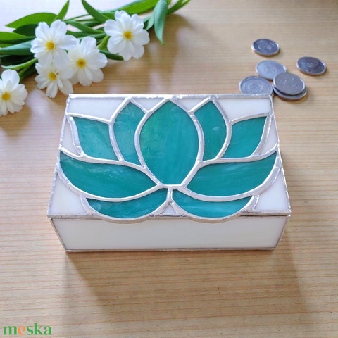 Esküvőre ajándékot választani sokszor nehéz feladat. Az ajándék nem csupán egy gesztus, hanem jókívánság, áldás és üzenet az ifjú pár számára. Ha szeretnél valami személyeset adni, ami túlmutat a pénzen, a legjobb helyen vagy! Ez a türkiz lótusz mintás üveg doboz pontosan ezért született meg a műhelyemben, hogy a nászajándék ne csak átadásra kerüljön, hanem csodás emlékké váljon.