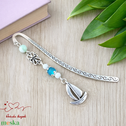 A vitorlás motívum a felfedezést, az új irányokat és a gondtalan elmerülést szimbolizálja, míg a türkiz és menta árnyalatú gyöngyök friss, harmonikus megjelenést kölcsönöznek a könyvjelzőnek.