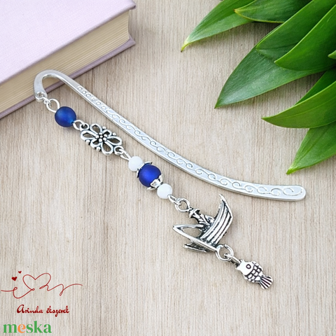 A csónak és hal motívum a vízparti csendet, a türelmet és a kikapcsolódás élményét jelképezi, míg a kék árnyalatú gyöngyök a víz és az ég harmóniáját hozzák el az olvasás pillanataiba.