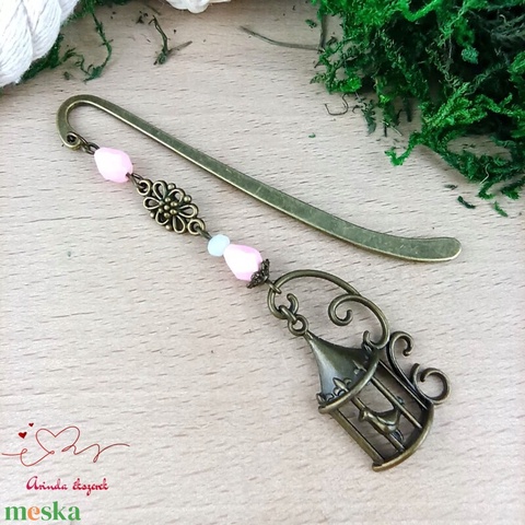 A madárkalitka motívum finoman utal az álmokra, a belső világ gazdagságára és a történetekbe való elmerülésre, míg a rózsaszín árnyalatú gyöngyök lágy, romantikus megjelenést kölcsönöznek a könyvjelzőnek.