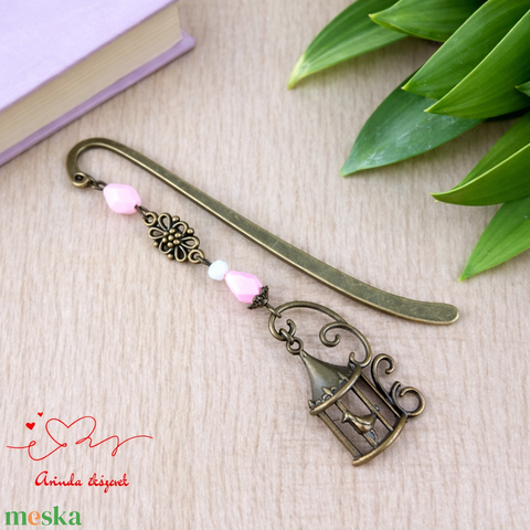 Rózsaszín madárkalitkás könyvjelző – egyedi, kézműves ajándék olvasóknak