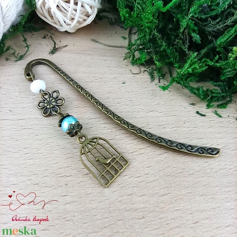 Világoskék madárkalitkás könyvjelző – egyedi, kézműves ajándék olvasóknak