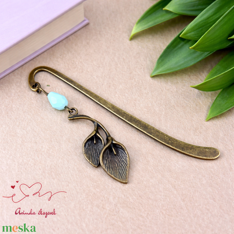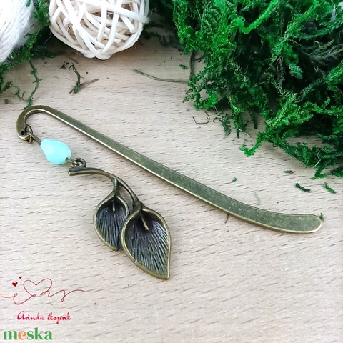 A kála virág motívum a tisztaságot, a kifinomultságot és az új kezdeteket szimbolizálja, míg az antik bronz színvilág és a lágy türkiz gyöngy harmonikus, természetközeli megjelenést ad a könyvjelzőnek.