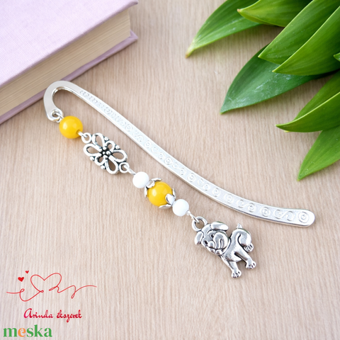 Ez az egyedi, kézzel készült fém könyvjelző a kutyák iránti szeretetet és az olvasás örömét vidám, napfényes hangulatban jeleníti meg.