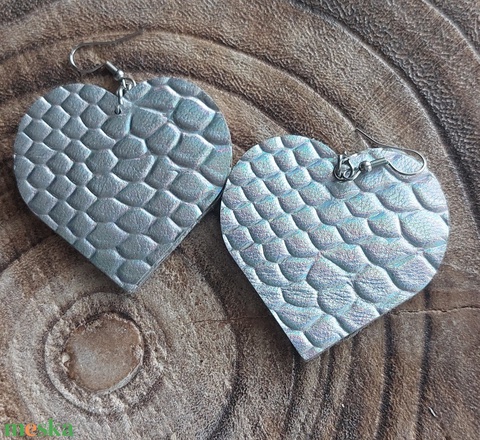 Ezüst fémes hatású szív alakú bőr fülbevaló